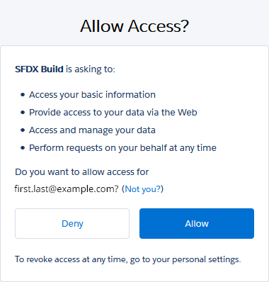 Now open your browser, copy the URL we created and paste it into your browser. You should be directed to a page asking you to login to Salesforce. Once logged in you will be asked to confirm that you are okay with the connected application accessing your Salesforce Org and data on your behalf. Go ahead and indicate that it's okay and you agree.